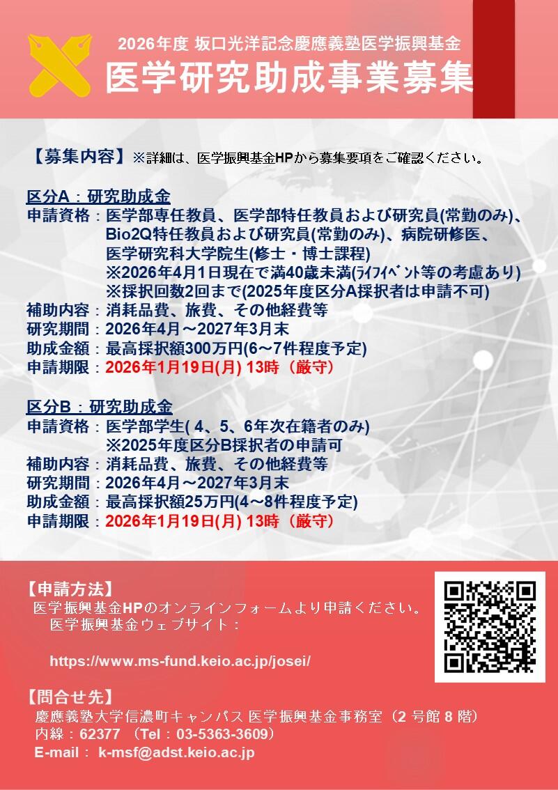 - (終了)2025年度医学研究助成事業の募集を開始しました / (Application Closed)Recruitment for FY2025 Keio University Research Grants for Medicine and the Life Science